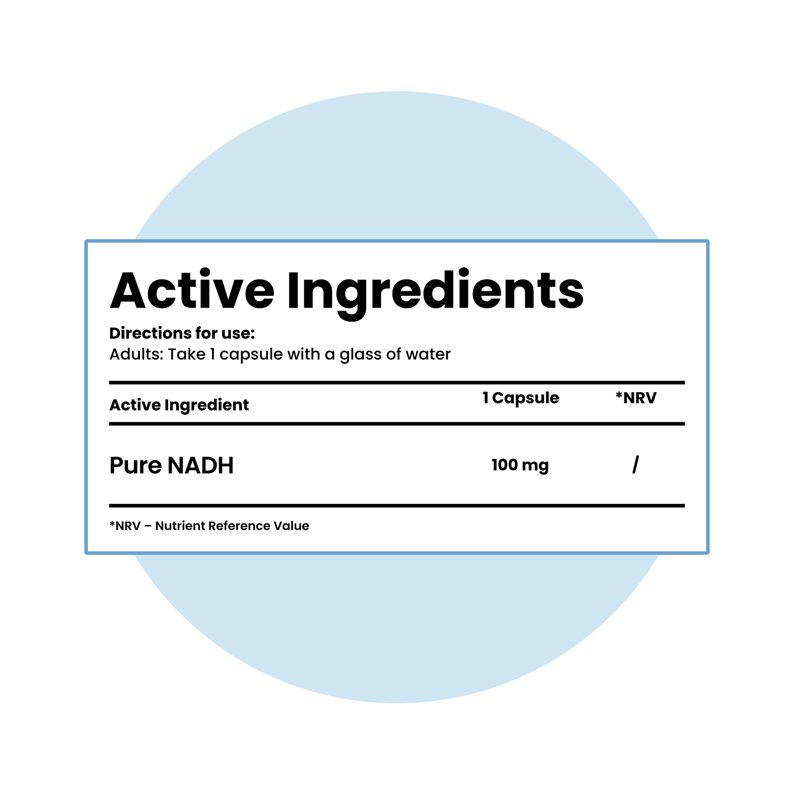 Contains 100 mg of stabilized, bioavailable NADH — a powerful amount based on clinical research into cellular energy, focus, and performance.